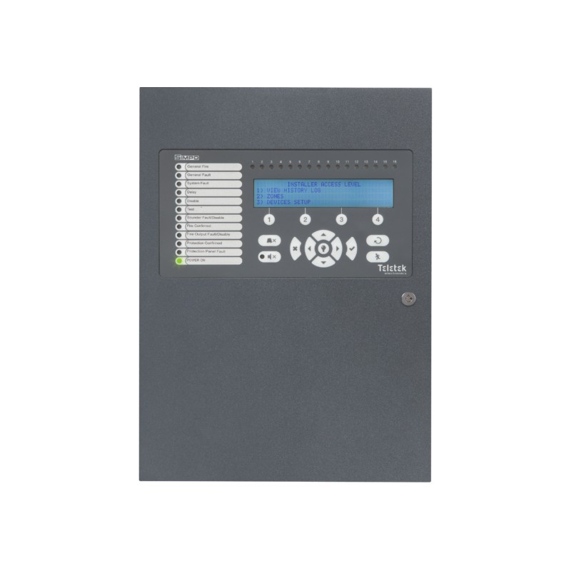 Centrala adresabila incendiu cu 1 bucla extensibila la 2 bucle, 250 adrese pe bucla, memorie 10000 evenimente,16 zone; afisaj LCD 4x40 caractere; sursa interna de 65 W, necesita un acumulator 12 V/18 Ah, EN54-2/4, CE, CPD